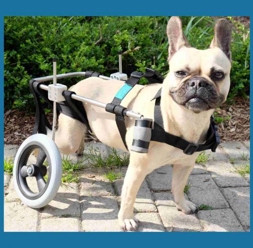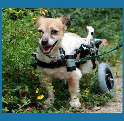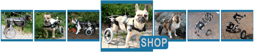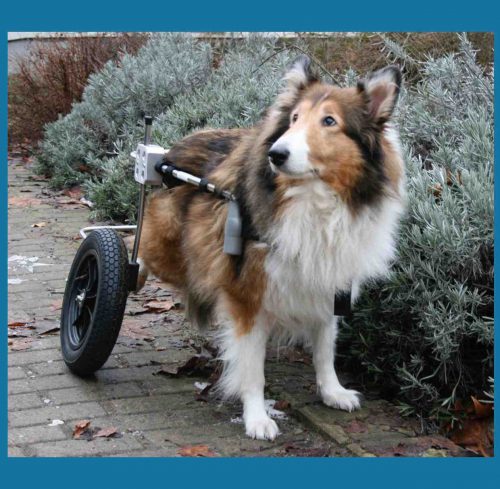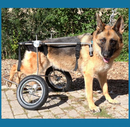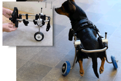 Leicht-Edelstahl – leichte und hochstabile Rollwagen zum entlasteten Mitlaufen, Pfotenhebeschuhe gegen Krallenschleifen/ Überköten und Expander für den Schwung nach vorne.